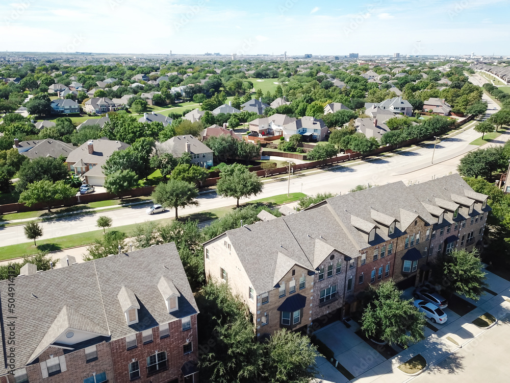 Brand new three story townhomes with attached garage next to single family residential neighborhood with golf course in North Texas, America