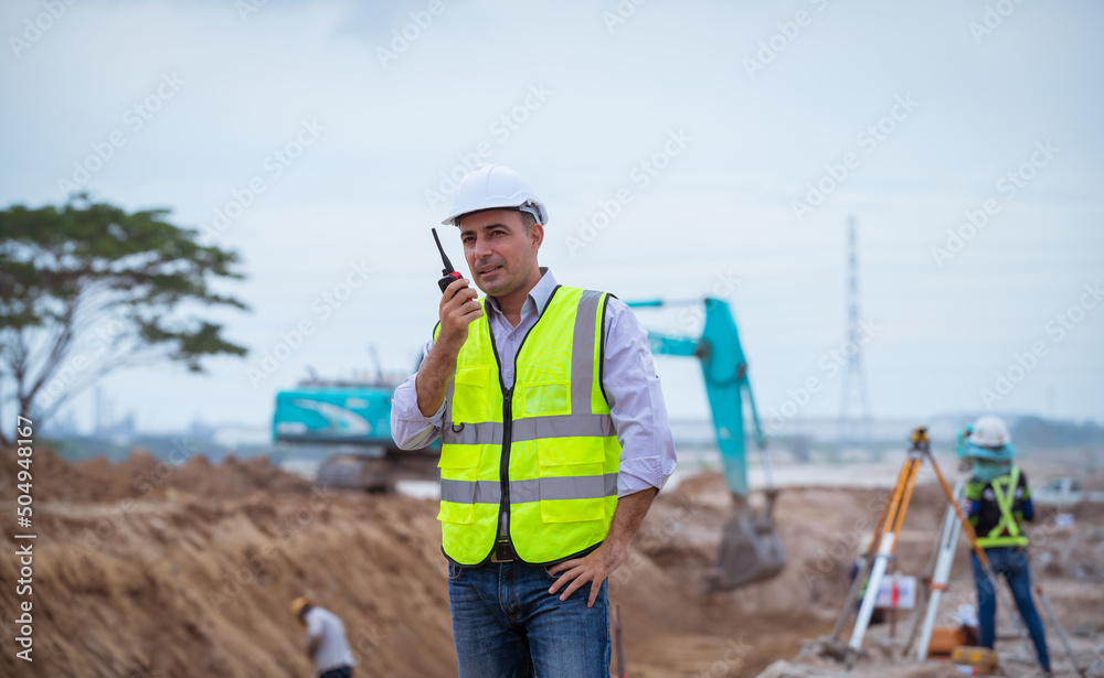 Surveyor engineer wearing safety uniform and helmet with equipment theodolite to measurement positioning on the construction site of the road with construct machinery background