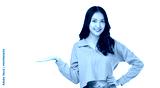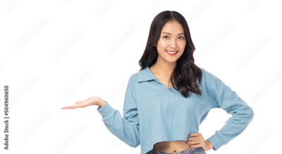 Young asian woman holding copy space imaginary on her palm to insert ad Stand over isolated on white background Portrait happy smiling girl holding copyspace on beauty palm hand Looking at camera