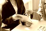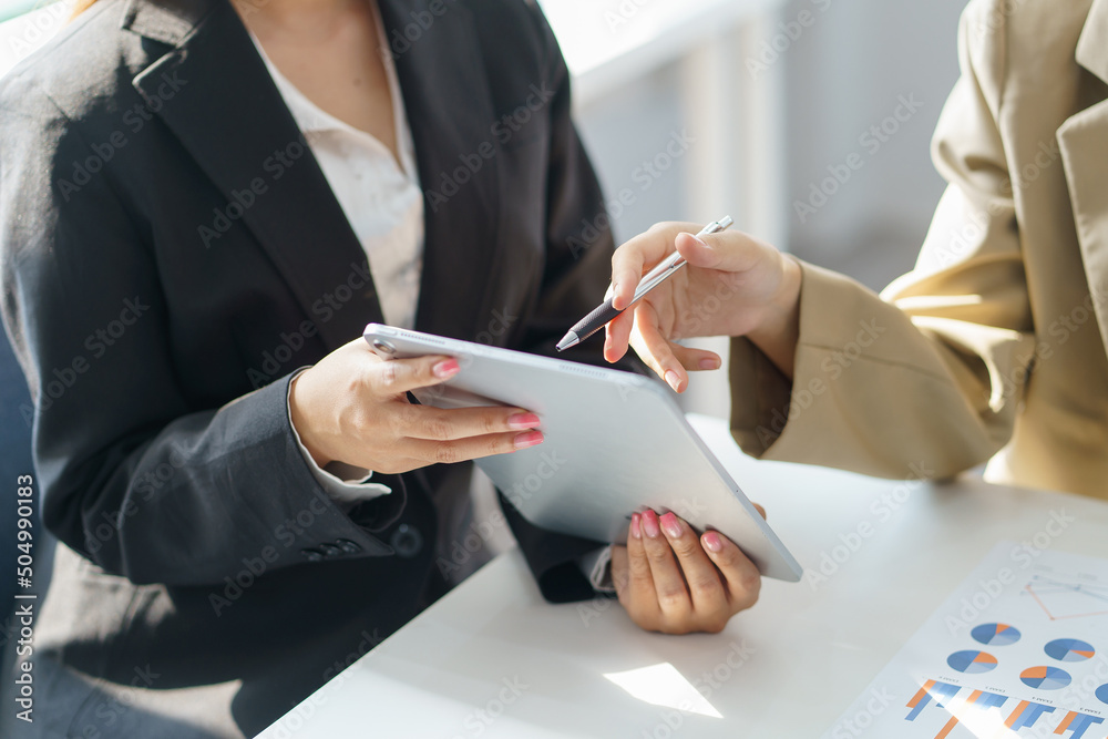 Two businesswoman discuss investment project working and planning strategy on digital tablet. Business people talking together with tablet at office.