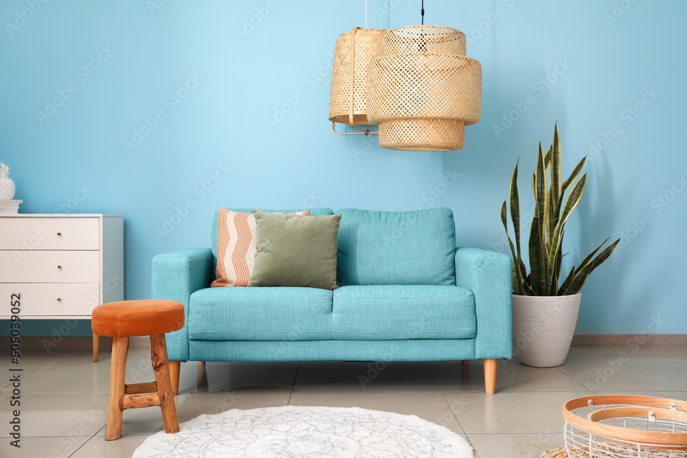 Interior of stylish living room with comfortable sofa near blue wall