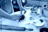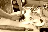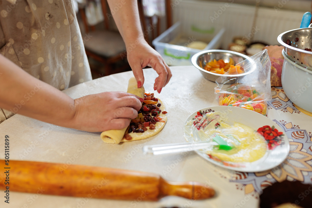 female hands twist the dough with raisins and candied fruits. raw cake dough