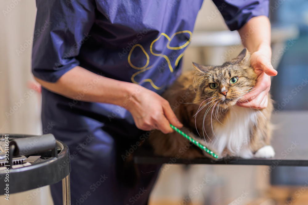 Cat grooming, combing wool. Express molt. Beautiful cat in a beauty salon. Grooming animals, combing hair