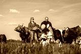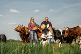 craftsmanship hands have a tomme cheese in the hands of a cheesemaker. Happy farmers family in green field with big cow in a green field with flowers on a sunny summer day