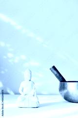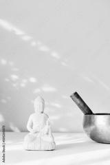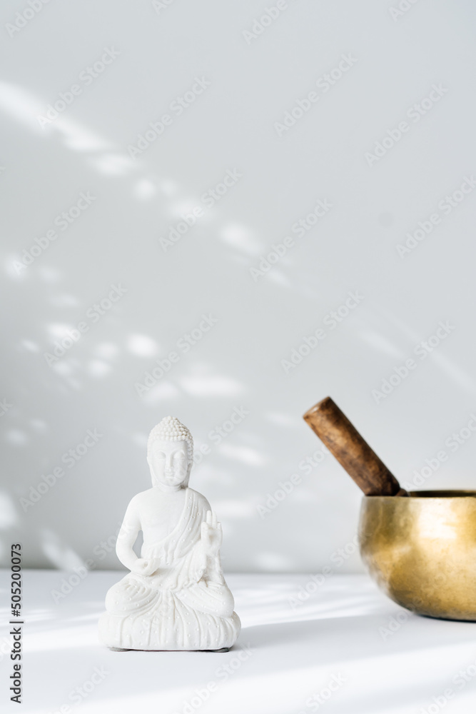 Decorative white Buddha statuette and tibetian singing bowl on the white background with sun light shadows. Meditation and relaxation ritual. Exotic massage. Minimalism. Copy space. Selective focus