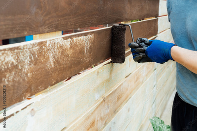 Close up man worker paints with a roller a wooden board fence in the garden. DIY, Do it yourself concept. House improvement. Home renovation and refurbishment. Selective focus, copy space.