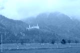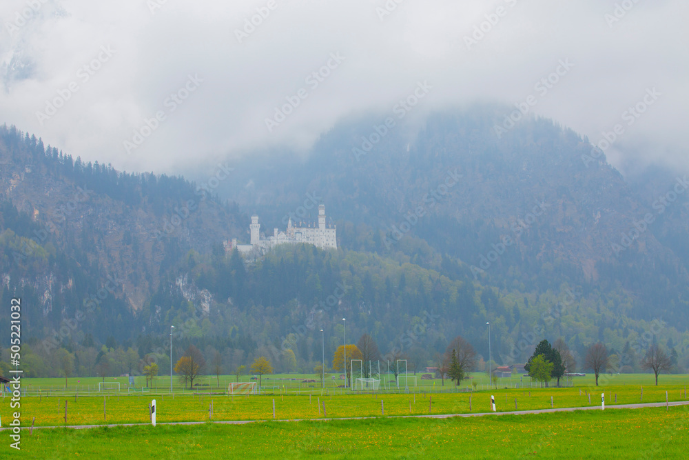 Fall scenery of Bavarian countryside in Schwangau, Germany, Europe, with view of majestic St. Coloman Church and beautiful trees standing in the green meadow on a foggy autumn morning