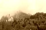 Fall scenery of Bavarian countryside in Schwangau, Germany, Europe, with view of majestic St. Coloman Church and beautiful trees standing in the green meadow on a foggy autumn morning