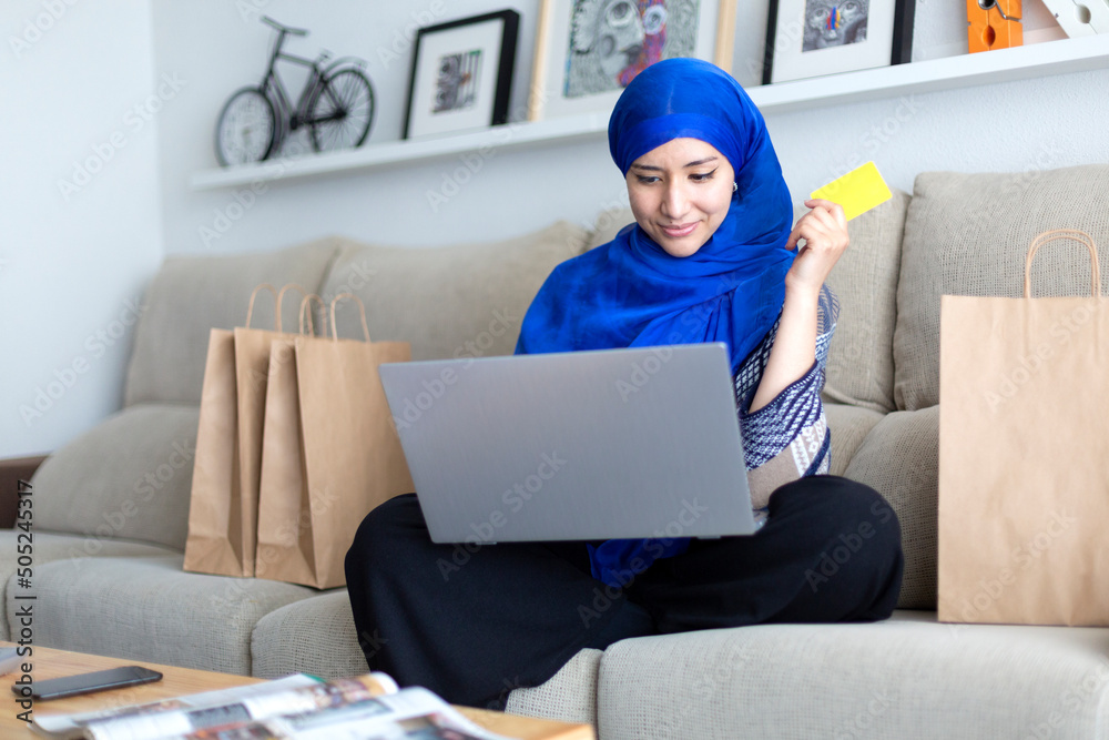 Young Muslim woman shopping online from home with credit card and laptop.