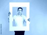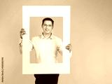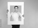 Young man. Indian man holding white frame. Student in white shirt. Businessman in glasses smiles. Male model on yellow. Human brunette in business clothes. Portrait of successful guy.