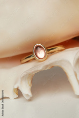 Ring product shot. Golden ring on marine shell background. Jewelry fashion photography.
