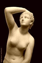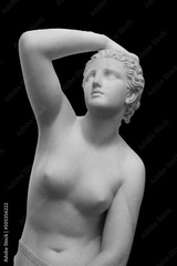 White marble sculpture head of young woman. Statue of sensual renaissance art era naked woman in circlet antique style isolated on black background