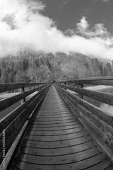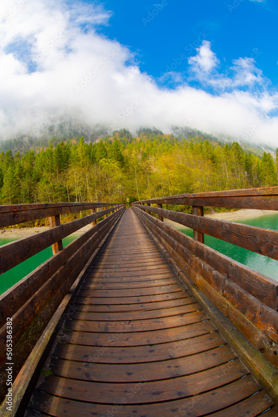 Beautiful austrian mountain lake plansee with reflection of the mountains and clouds in the crystal clear calm water