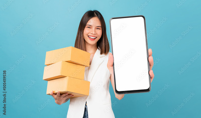 Smiling beautiful Asian woman holding cardboard boxes and hands show smartphone mockup of blank screen on blue background. Take your screen to put on advertising. Concept delivery online.