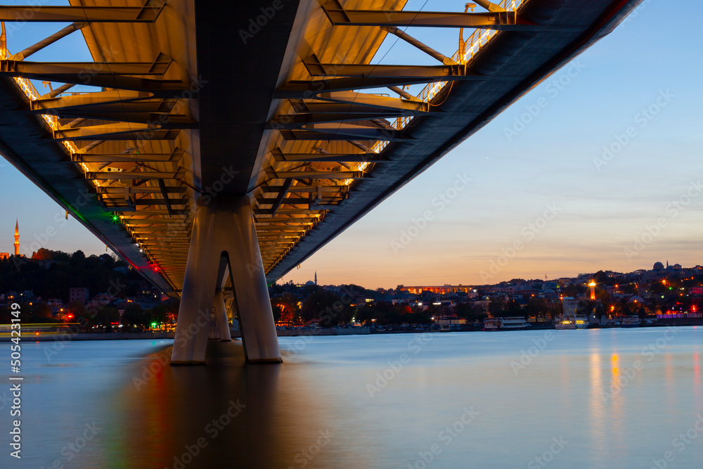 Halic Metro Bridge And Golden Horn At Night, Istanbul, Turkey
