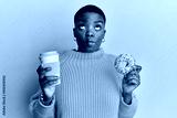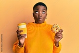 Young african american woman eating doughnut and drinking take away coffee making fish face with mouth and squinting eyes, crazy and comical.