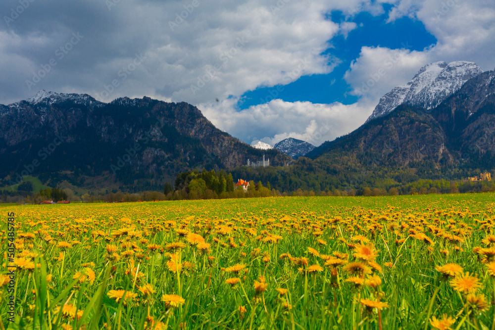 Beautiful view of world-famous Neuschwanstein Castle, the nineteenth-century Romanesque Revival palace built for King Ludwig II on a rugged cliff near Fussen, southwest Bavaria, Germany.
