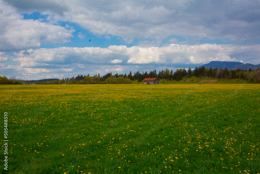 Chapel at Hegratsrieder See lake on an autumn morning, Ostallgäu, Bavaria, Germany
