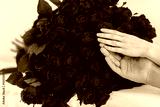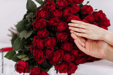close-up of man and woman hands with engagement rings. Hands of the on the background of the big bouquet of red roses. romantic proposal time