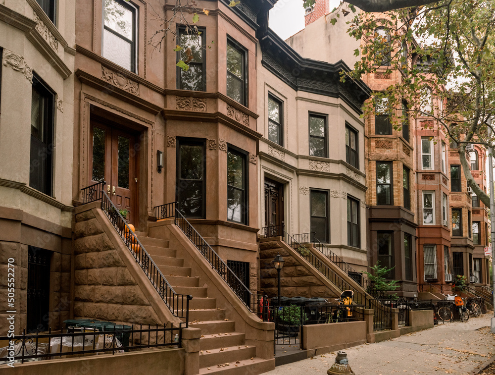 Scenic view of a classic Brooklyn brownstone block with a long facade and ornate stoop balustrade in Park Slope neighborhood, New York, USA