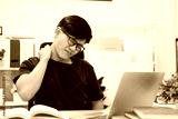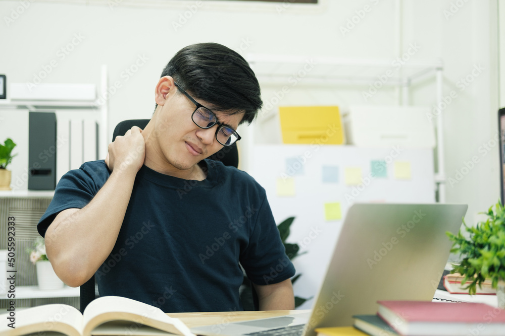 Young asian man with office syndrome have problem with part of body arm shoulder head neck back.
