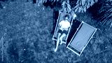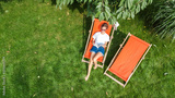 Young girl relaxes in summer garden in sunbed deckchair on grass, woman reading book outdoors in green park on weekend, aerial drone view from above