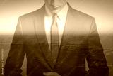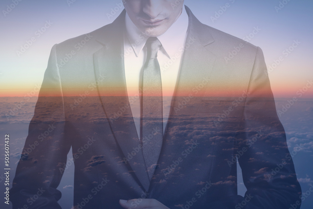 Double exposure of a man standing above the clouds. Vision, self belief.