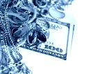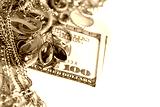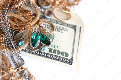 Many expensive golden and silver jewerly rings, earrings and necklaces with big amount of US dollar bills on white background. Pawnshop or jewerly shop
