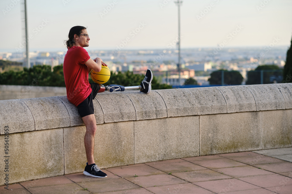 Man with a disability holding a basketball while relaxing sitting outdoors.