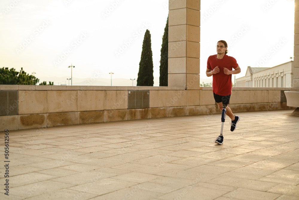 Male athlete with a disability running outdoors. Man with prosthetic leg running.