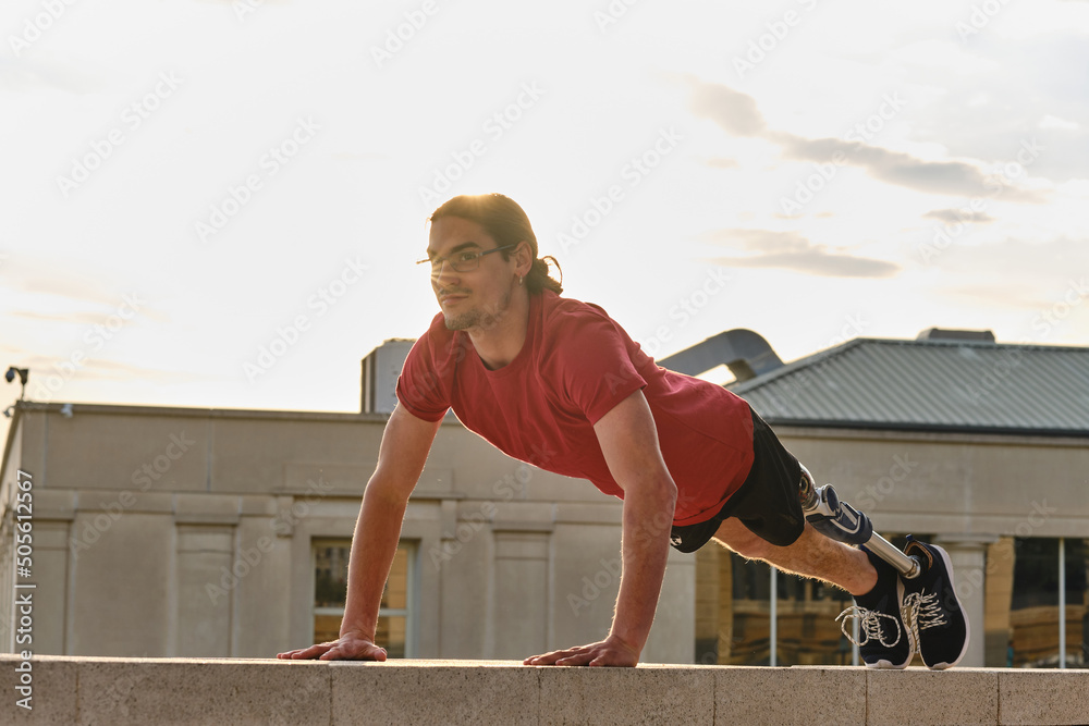 Man with a disability doing push-ups while enjoying exercising outdoors.