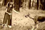 the girl feeds a wolf. the fairy tale " Red Riding Hood"