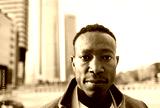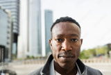 African business man working outside of the office with city in background - Focus on face