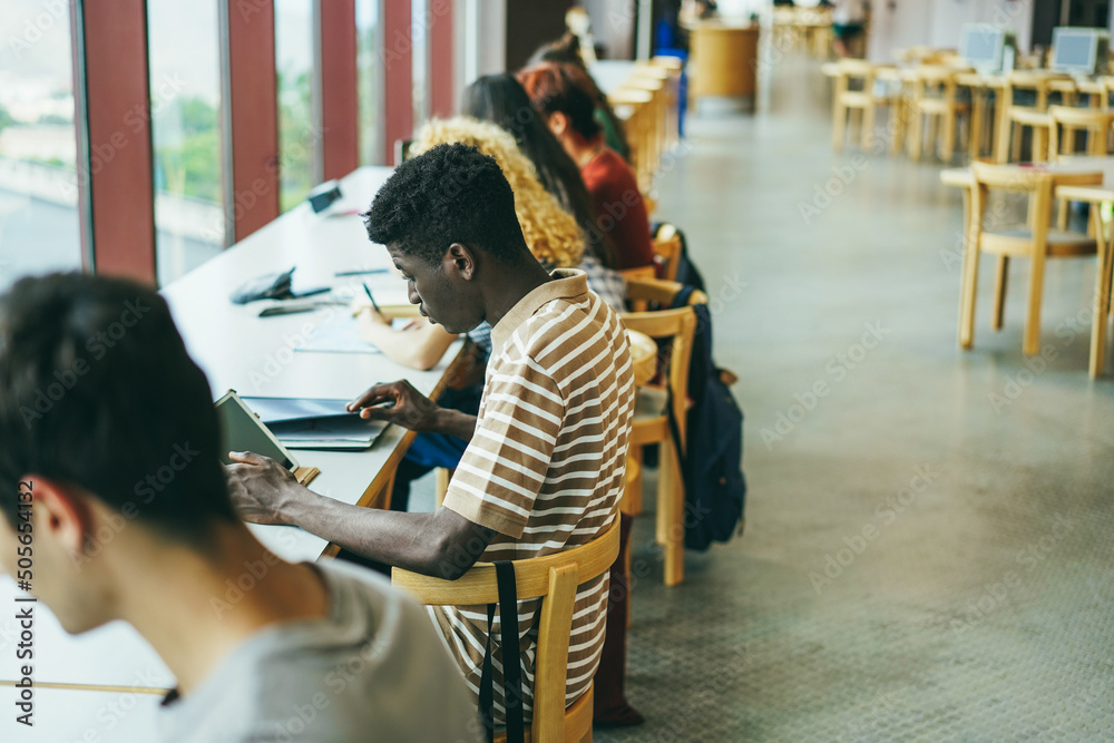 Young multiethnic group of students studying inside university library - Main focus on african man ear