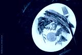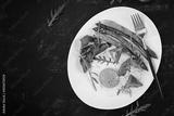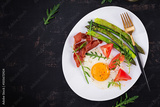 Fried egg with asparagus, tomato and bacon. Useful breakfast. Top view, overhead