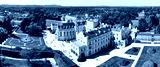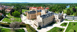 Lednice Chateau extra wide panorama aerial photography with garden and park on summer day. Lednice - Valtice landscape, Czech South Moravia region. World Heritage Site.