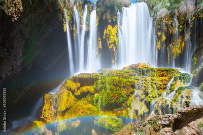 Yerkopru Waterfall and canyon on Goksu River is located in a small town named Hadim of Konya province in Eastern Mediterranean region of Turkey. Waterfall in nature wonder. View of the river. camp