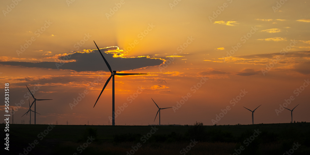 Wind turbines at sunset. Wind turbines in the orange sky. Rural areas with renewable energy sources. The concept of environmental safety green energy. Landscape with windmills. Sustainable development