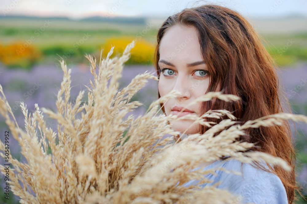 romantic girl with a large bouquet of dried flowers and a romantic look through, yellow reeds