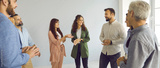 Team of happy business people having interesting discussion during break at conference or in group meeting. Businesswoman and businessman talking and sharing opinions. Website banner header background