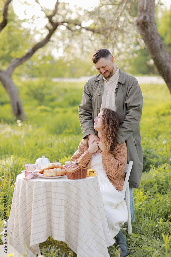 Young couple enjoying food and drinks in beautiful summer green park on romantic date picnic, handsome man and woman with curly hair are hugging outdoors
