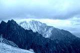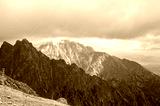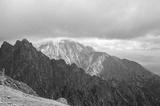 Sharp peaks and rocks on mountainside surrounded by clouds in High Tatras, Slovakia