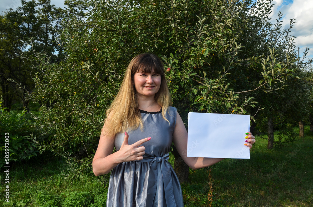 Front view of smiling young stylish brunette girl pointing at white paper sheet in her hand posing on nature background. Concept of advertising.