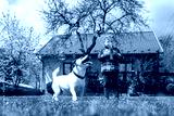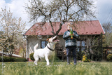 Little boy making a soap bubbles from bubbles gun while playing with his dog on a grass lawn near house