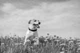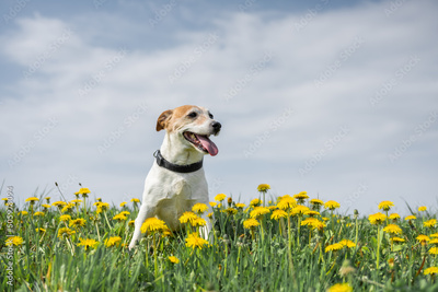 Jack Russel Terrier on yellow flowers meadow. Happy Dog with serious gaze