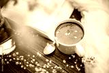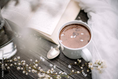 Cup of hot chocolate cacao, old book and spring cherry flowers on wooden background. Reading concept
