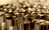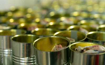 Canned fish factory. Food industry. Many can of sardines on a conveyor belt. Sardines in tinned cans at food factory. Food processing production line. Food manufacturing industry. Cans industry.