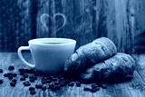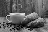 Breakfast is served with smoked coffee in a heart shape. There are coffee beans on the ground.