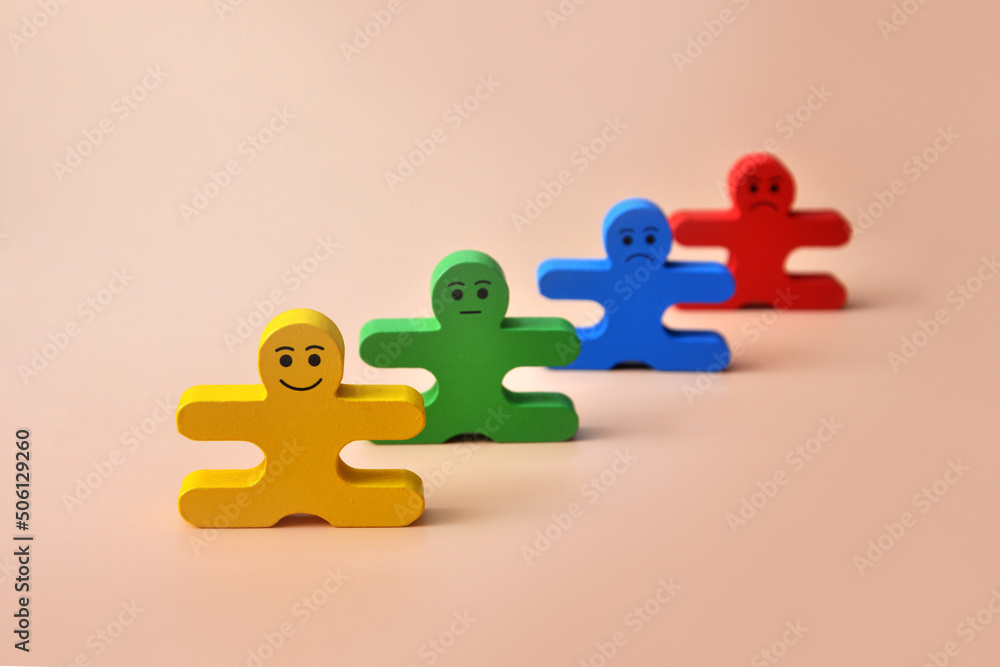 wooden men and various emotions on them: joy, sadness, anger, sadness, tranquility.