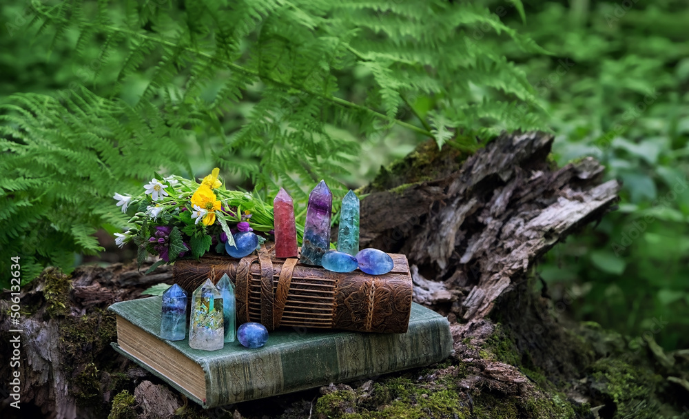 old witch books and quartz minerals on natural forest background. Gemstones for healing Magic Crystal Ritual, Witchcraft, spiritual esoteric practice, Reiki therapy, harmony soul, life balance.
